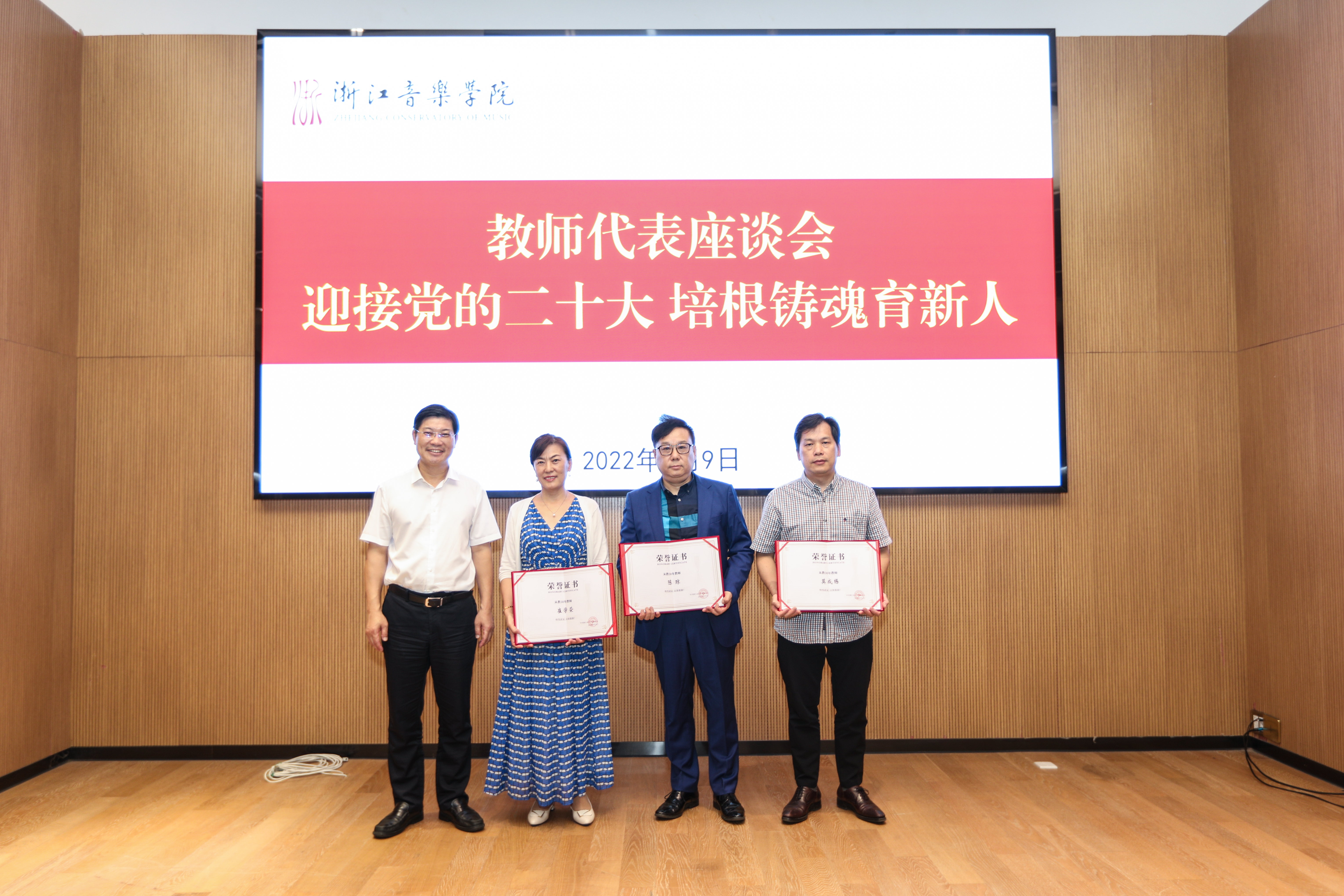 座谈会上,干武东代表学院向辛勤耕耘在教学科研、艺术创表、管理服务等各条战线上的教职员工以及为学院建设、改革、发展付出心血与汗水的退休老教师们致以崇高的敬意,对受到表彰的教师表示衷心的祝贺。他指出,教师是学院创业发展最宝贵的财富,是学院大家庭最可敬的园丁,是“高水平一流音乐学院”建设最重要的力量。学院要培育塑造大作、大师、大幕和大我,全面推进“高水平一流音乐学院”建设,教师队伍是重中之重,是最重要的基础力量。他对广大教师提出三点希望:一是学思践悟,高举思想之旗,深入学习习近平总书记关于教育、文艺的重要论述精神和省第十五次党代会精神,努力在培育塑造大作、大师、大幕、大我中躬身入局、砥砺前行,比学赶超、走在前列;二是立德树人,勇担世范之责,不断提高自身道德修养,做为人师表的大先生、勇于担当的艺术家、懂规守纪的好老师,真正将社会主义核心价值观教育融入教书育人、舞台实践全过程;三是上下齐心,共立精神之柱,要以最终凝练的“浙音人价值观”为大家的共识,并转换为共同的精神动力,在爬坡过坎、变革重塑的关键时期,有力推动学院各项事业的高质量发展,以优异成绩迎接党的二十大胜利召开。