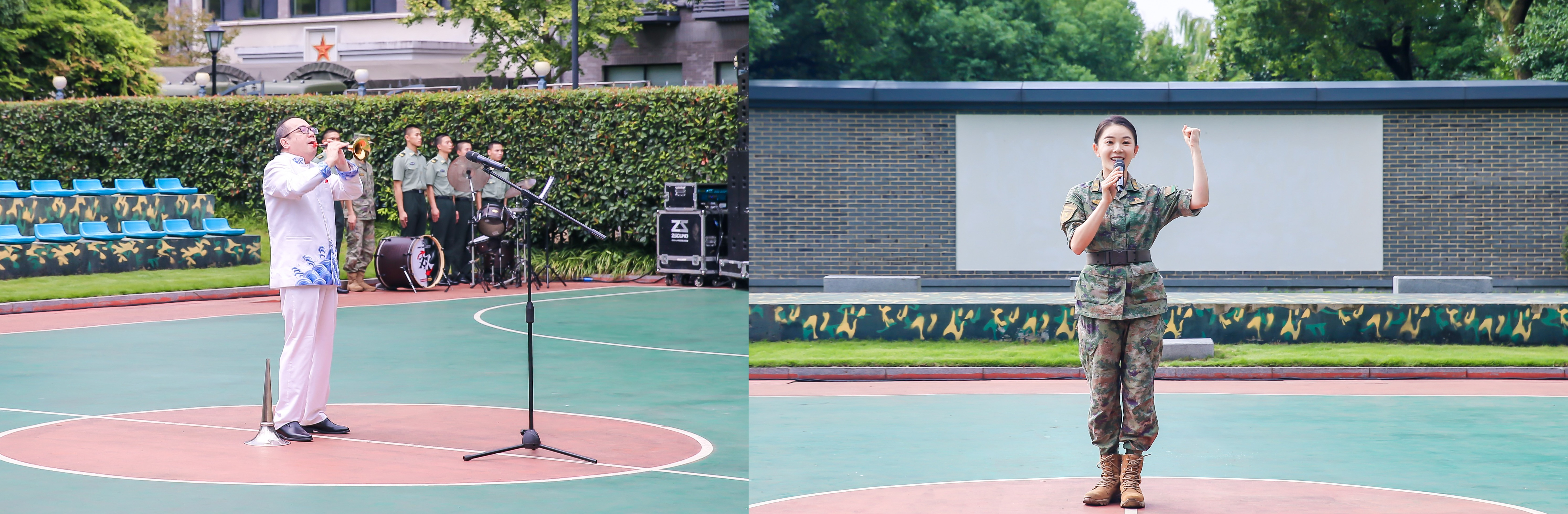 随后,在国防教育主题园的篮球场上举行了一场别开生面的“文艺轻骑兵”慰问演出。浙音师生与省军区官兵倾情呈现《梦想天堂》《打枣》《芦花》《雄师风采》《离别开出花》《当兵光荣》《当那一天来临》《我和我的祖国》等节目,每一个节目都饱含深情,展现了对国家和军队的无限热爱。