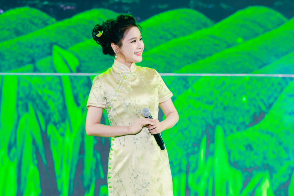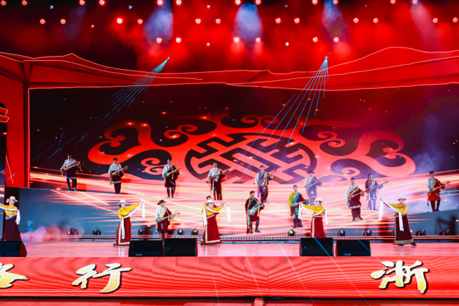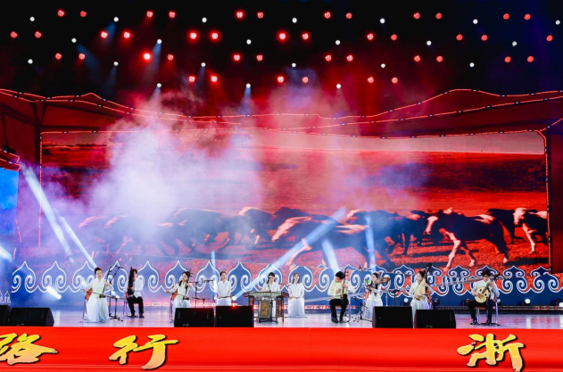 随着优美的曲调响起,江南女子踏石而行,在碇步桥上缓缓走来,一群身着淡雅旗袍、手持采茶篮的民歌手登场,呈现一幅江南采茶图。灯光一转,一股来自草原的粗犷气息扑面而来,舞者们手持马鞭,演绎着赛马、摔跤等那达慕大会上的传统项目。观众们仿佛穿越时空,在西子湖畔的柔美与柴达木盆地的壮阔间自由穿梭,感受两地文化的碰撞与交融。