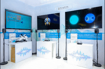 在2号展区,观众体验搭载无线传感技术的自制数据驱动乐器《赛蒙塔》、以京剧打击乐和脸谱为素材创作的音画交互装置《争鸣》,以及通过操纵数据驱动乐器的3D拉绳传感器《觅声》。