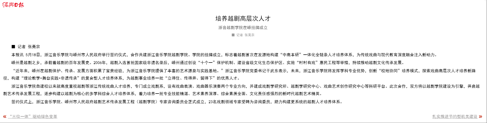 绍兴日报:培养越剧高层次人才 浙音越剧学院在嵊挂牌成立