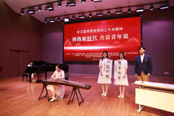 主题团日活动采用理论学习、心得分享与艺术表达相结合的多元形式进行。活动由文艺轻骑兵、音乐教育学院学生杭致高、钱凯瑞带来的竹笛二重奏拉开帷幕。浙江广电集团“新闻采编雁行队”队员、融媒体新闻中心谭涵以00后的视角,讲述学习二十大精神的心得感悟,呼吁各位青年为实现乡村振兴、推动共同富裕贡献自己的力量。省残联团委负责人、省党代会代表朱娜结合援鄂经历,展示了争当促进残疾人共同富裕模范先锋的热情。来自省文旅厅的浙江演艺集团浙江曲艺杂技总团青年党员张楚君号召大家,要肩负起“文艺浙军”的重任,在建设“重要窗口”和共同富裕示范区中展现文艺担当。“行走的宣讲留声机”成员、音乐教育学院19级学生叶悦莹讲述了自己参加社会实践的经历,呼吁大家做一粒传播音乐的种子,争做有理想、敢担当、能吃苦、肯奋斗的新时代青年。此外,音乐教育学院学生杨铭铭、潘跃通过古筝和钢琴演奏传达宋韵之美,校学生书画大赛一等奖获得者、音教学院学生袁天翼现场泼墨,将“弘毅尚德 博约精艺”的浙音人价值观写在团员青年的心里。主题团日在全体团员青年学唱歌曲《领航》中落下帷幕。青年党员教师狄佳文现场教学,现场歌声涌动,氛围热烈,用歌声献礼二十大,拥抱新时代。参会团员们表示,此次主题团日活动生动有趣,令人印象深刻。