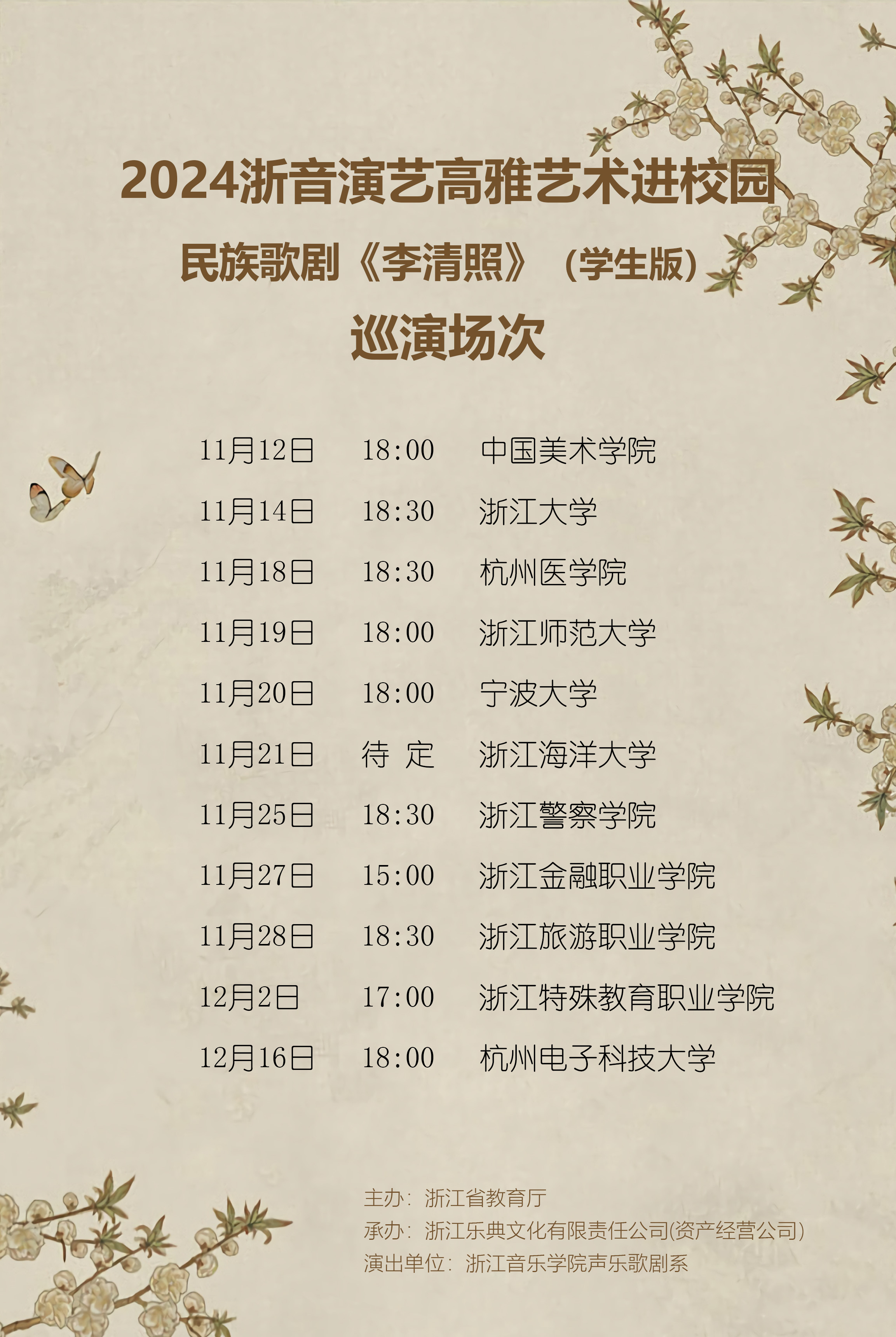 歌剧《李清照》将中西音乐艺术与戏剧表演方式相融合,展现了宋朝的艺术美学与中华文化的独特魅力。接下来,该歌剧将在浙江大学、宁波大学、浙江师范大学等11所高校巡回演出,旨在加强校园文化建设,推进学校美育工作,提升学生的文化艺术素养,激发青年一代的艺术创造力和文化自信。