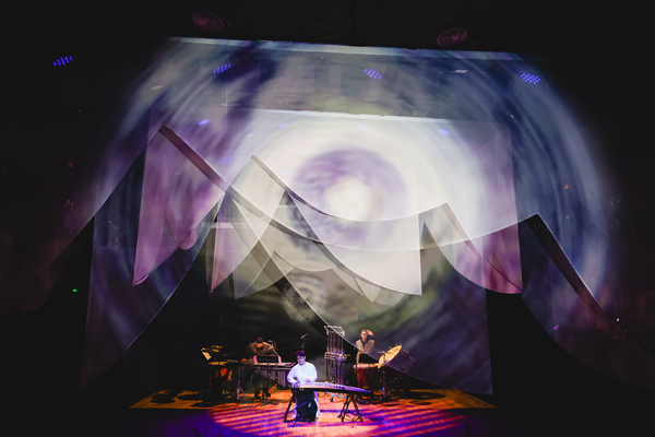 该项目以富春山江的人文景致为灵感来源,融合了视觉艺术与环境舞蹈艺术,用“氛围沉浸式”的音乐剧场形式,将观众带入到充满诗意梦幻的富春音景中。这一艺术形式以当代音乐为主要载体,通过视觉艺术与环境舞蹈的加入,让观众更加身临其境的感受到音乐所要传递出的抽象内容。为达到这一艺术形式的最佳观演体验,在音乐厅有限的造景条件下,导演张昕利用不同剧场独有的空间特点,进行音乐会的视觉形式构建与演员空间调度,既要保证室内乐音响的最佳听感,又要让观众能够完全沉浸在环境舞蹈与即兴演奏所刻画的音乐生景中。也正是因为艺术家们要面临各种极限演出的条件限制,才激发出了他们更大的创造力与表演张力。在这样一个独特沉浸式的艺术场域中,观众们近距离的感受着艺术家们忘我的精彩演绎与情感释放,与他们的身体律动与音响的能量汇聚交流,完全沉醉在这如梦如幻的富春山江诗画音景中。