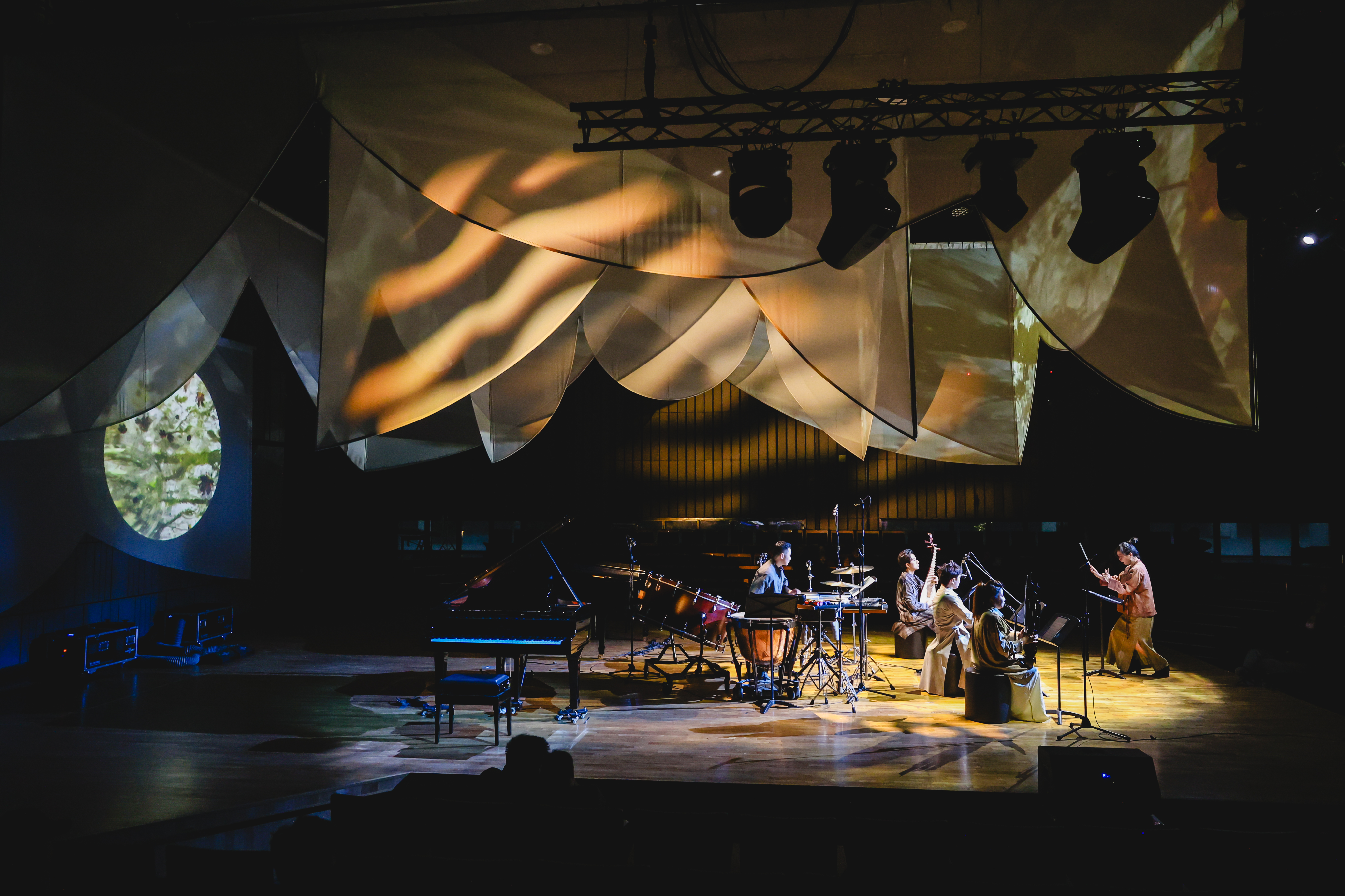 在音乐会的内容上,作曲家专门用诗意的格律感将其分成三个篇章,如一江春水向东流、独寻山间晚来风等,各篇章以演奏家与舞蹈家的即兴对话来叙事展开,整场音乐会在“视、听、动”的共构下,演绎出春去冬来的如梦景象。在这些作品中,象征富春山江四季容颜的《乐之流》《土土虫》《秋池》《幻石》诗画四部曲,通过作曲家独特的“拟态化创作技法”,在中西方乐器的共鸣下,将富春山江与原始自然的神韵,以及作曲家神秘且热烈的人文情愫,用抽象的艺术语言刻画出来。值得一提的是,张昕对音乐语言的娴熟驾驭与创造力,为其音乐创作的即兴表达筑牢根基,她与古筝演奏家刘乐在音乐的即兴演绎中,与舞蹈对话交融、共同生长,这样即时又鲜活的情感表达,让音乐在既定框架下拥有了自由驰骋的空间。在多元艺术的协同下,那潺潺溪流、巍峨山峰、缭绕云雾以及灵动飞鸟仿佛都随着音乐的律动跃然眼前,观众仿若置身富春盛景中,与艺术家们共同体验着自然的神奇、艺术的奇妙。
