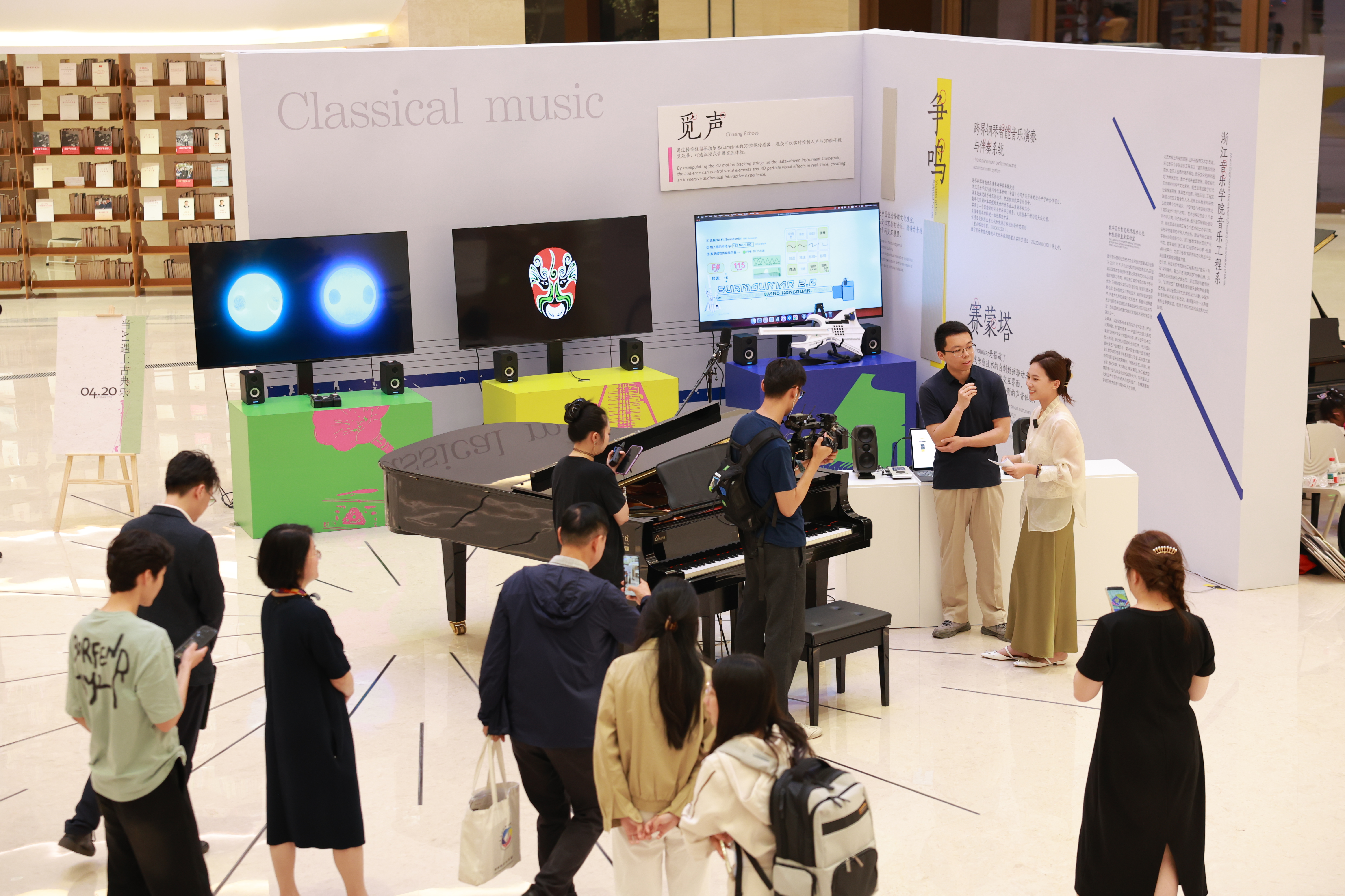 在学院社会合作中心支持下,音乐工程系师生的音画交互装置《争鸣》《觅声》、人工智能视觉景观与电子音乐《宋檐逸梦》、Surmountar数据驱动乐器、Yamaha跨界钢琴智能音乐演奏与伴奏系统等音乐与工程成果在浙江图书馆主会场活动中精彩亮相,让读者身临其境地体验传统文化与现代科技的碰撞。