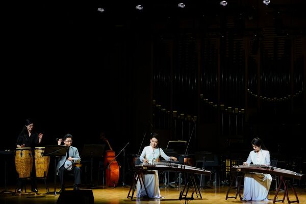 随后,由乐团青年二胡演奏家裴文钰与国乐系学生尤煊颍演绎了谭盾的二重奏作品《双阙》。作曲家将古朴的乐思与现代作曲技法相结合,使得乐曲在弓弦与琴竹的互动中展现出新的活力,凸显了其对传统演奏模式的突破性思考。