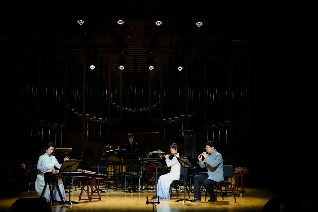 音乐会在周龙创作的四重奏作品《空谷流水》中拉开帷幕。该作品创新性地采用筝、竹笛、管子与组合打击乐的乐队配置,由国乐系师生马丽、张家瑞与乐团青年竹笛演奏家张晶洁、青年古筝演奏家董静怡联袂演绎。组合打击乐通过多层次的音色叠加,与弦、管的线性旋律形成对话,生动营造出空谷流水的自然意境。作品突破性的演奏技法与创作理念,对中国当代民族音乐的创新发展具有重要的先导和示范作用。