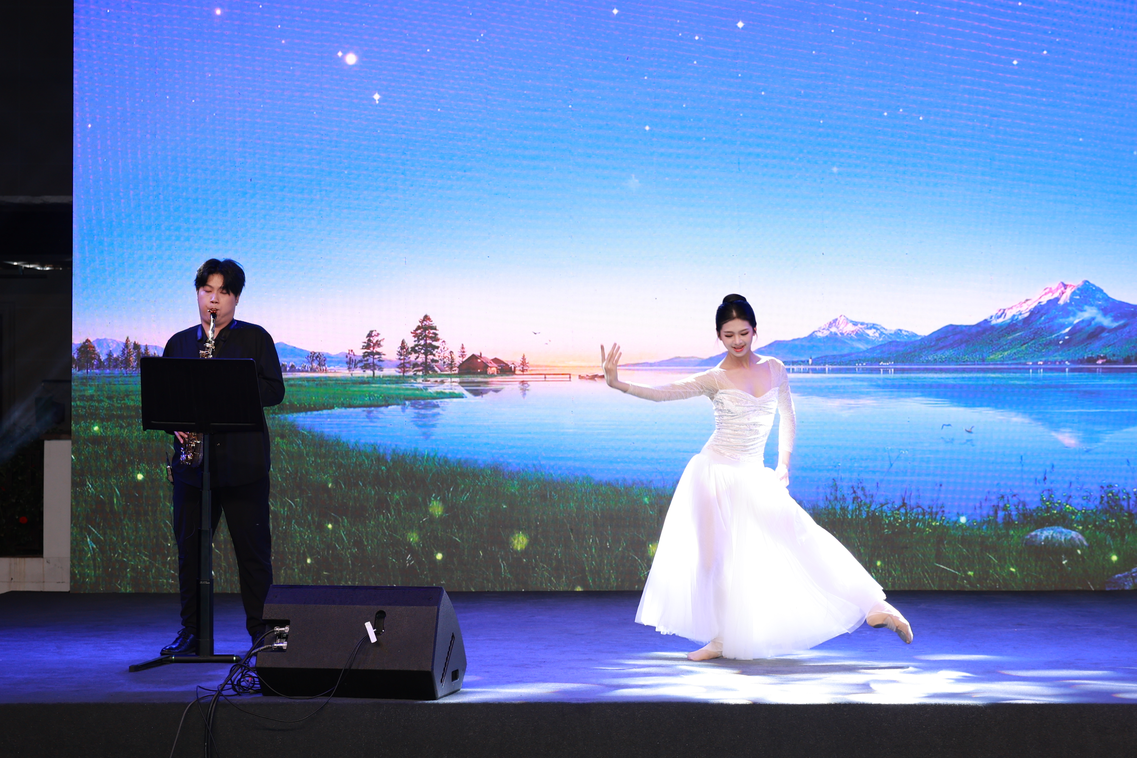 刚刚参加完纪念中国人民抗日战争暨世界反法西斯战争胜利80周年文艺晚会《正义必胜》归来的舞蹈学院方佳佳同学,则随着萨克斯的悠扬旋律,用芭蕾轻盈的舞步编织了一段精彩唯美的《贝加尔湖畔》美景。由声乐歌剧系青年教师沈贝贝带来的歌曲《芦花》,则深情诠释了新时代军人的柔情铁骨,受到现场观众的阵阵掌声。活动最后在全体演员合唱《我爱你中国》的嘹亮歌声中圆满落幕。