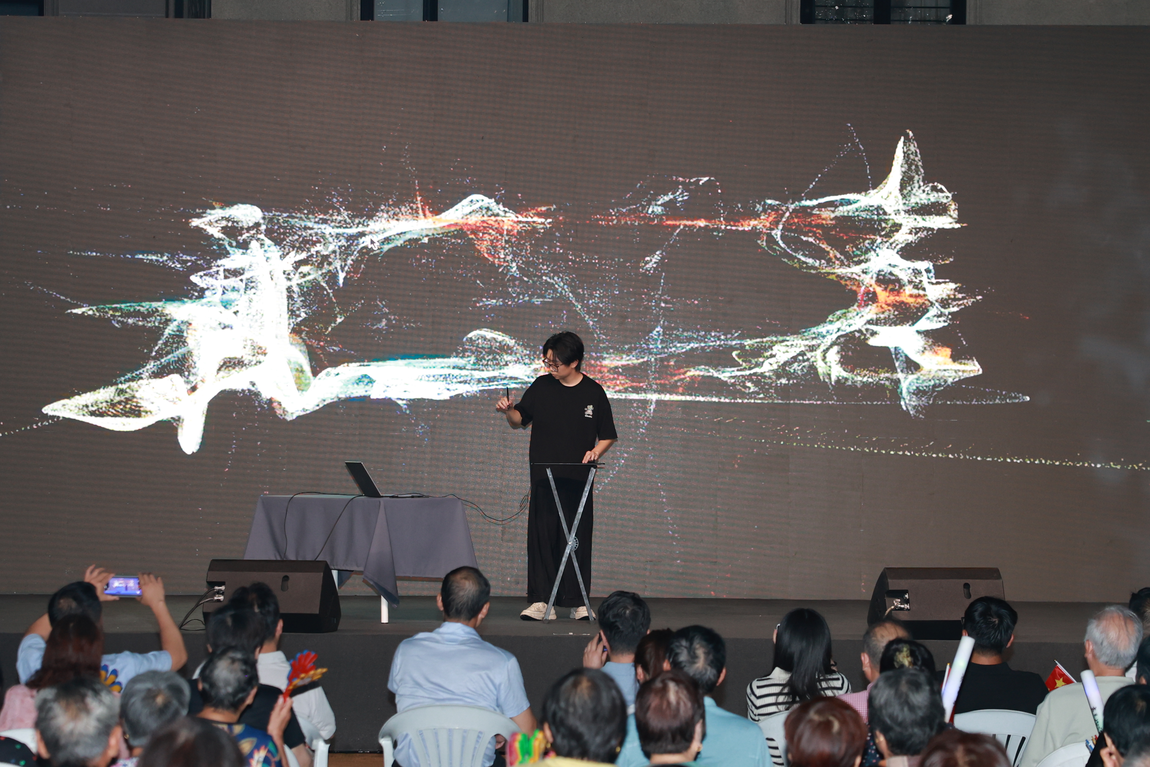 越剧经典《梁祝·十八相送》、男女声二重唱《等着我 我亲爱的人》、女声独唱《在水一方》等节目,更是让观众们沉浸在传统与现代交织的艺术氛围中。由音乐工程系学生黄舜杭带来的交互视听节目《缘因•弦起》,让人眼前一亮。该节目受《墨经》中“力,刑(形)之所以奋也”启发,通过数字技术与古琴声学原理的结合,从“弦起”到“源音”,以此达成与古人的跨时空对话,打造多感官的沉浸式艺术体验。