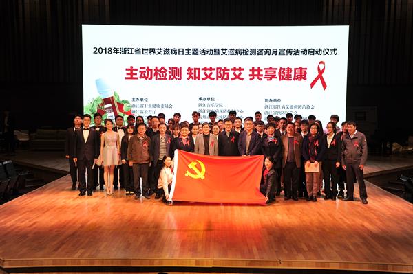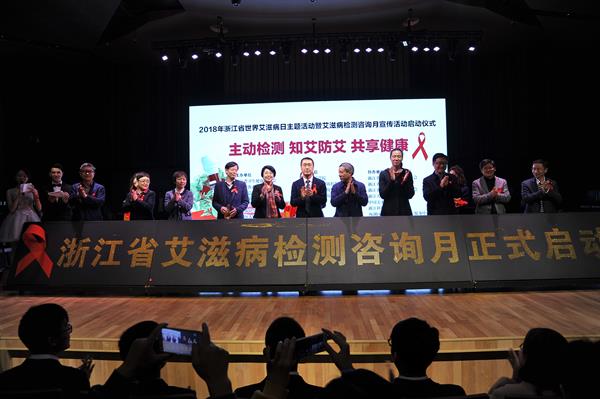 11月27日下午,2018年浙江省世界艾滋病日主题活动暨艾滋病检测咨询月宣传活动启动仪式在我院举办。浙江省卫生健康委副主任曹启峰,浙江省教育厅副厅长丁天乐,浙江省总工会副主席张卫华,共青团浙江省委副书记周苏红,杭州海关副关长陈孟裕,我院党委副书记贾秀英,西湖区人民政府副区长钱志清,浙江省疾病预防控制中心书记胡崇高,杭州市卫生和计划生育委员会副主任郑冰,杭州市疾控中心党委书记赵刚,西湖区卫计局党委书记、局长朱文,以及浙江大学、中国美术学院、浙江科技学院等高校近300余名师生参加。