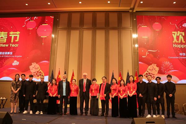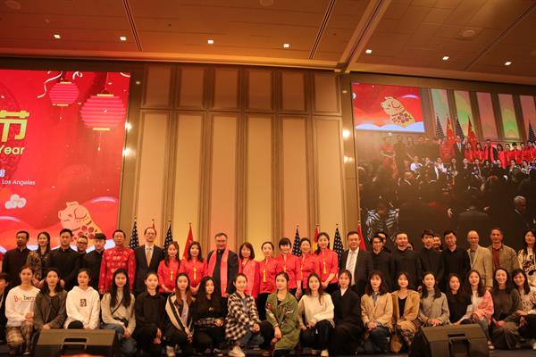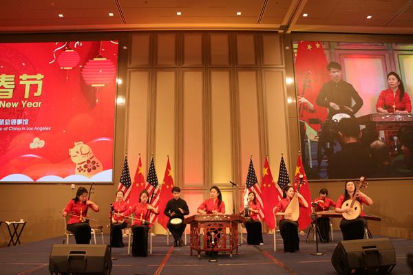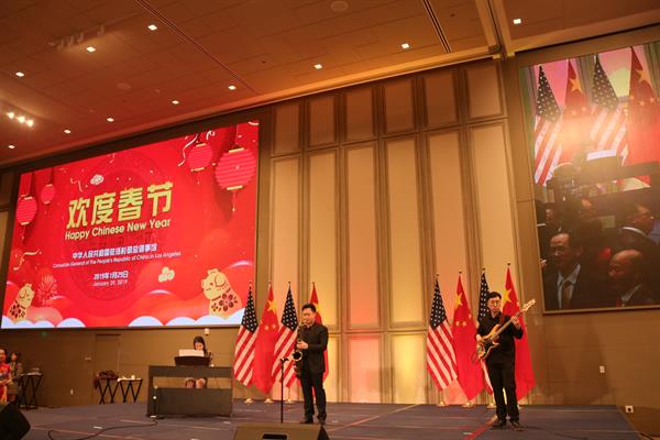 洛杉矶当地时间29日晚19点,我院艺术团受邀参加驻洛杉矶总领馆2019新春招待会演出。中国驻洛杉矶总领馆总领事张平及其夫人、美国国会众议员、加州众议员和参议员、洛杉矶县县政委员、圣盖博市议员、蒙特利公园市市长和议员、约巴林达市议员等地方民选官员以及南加州近600多位中美各界人士观看了演出。