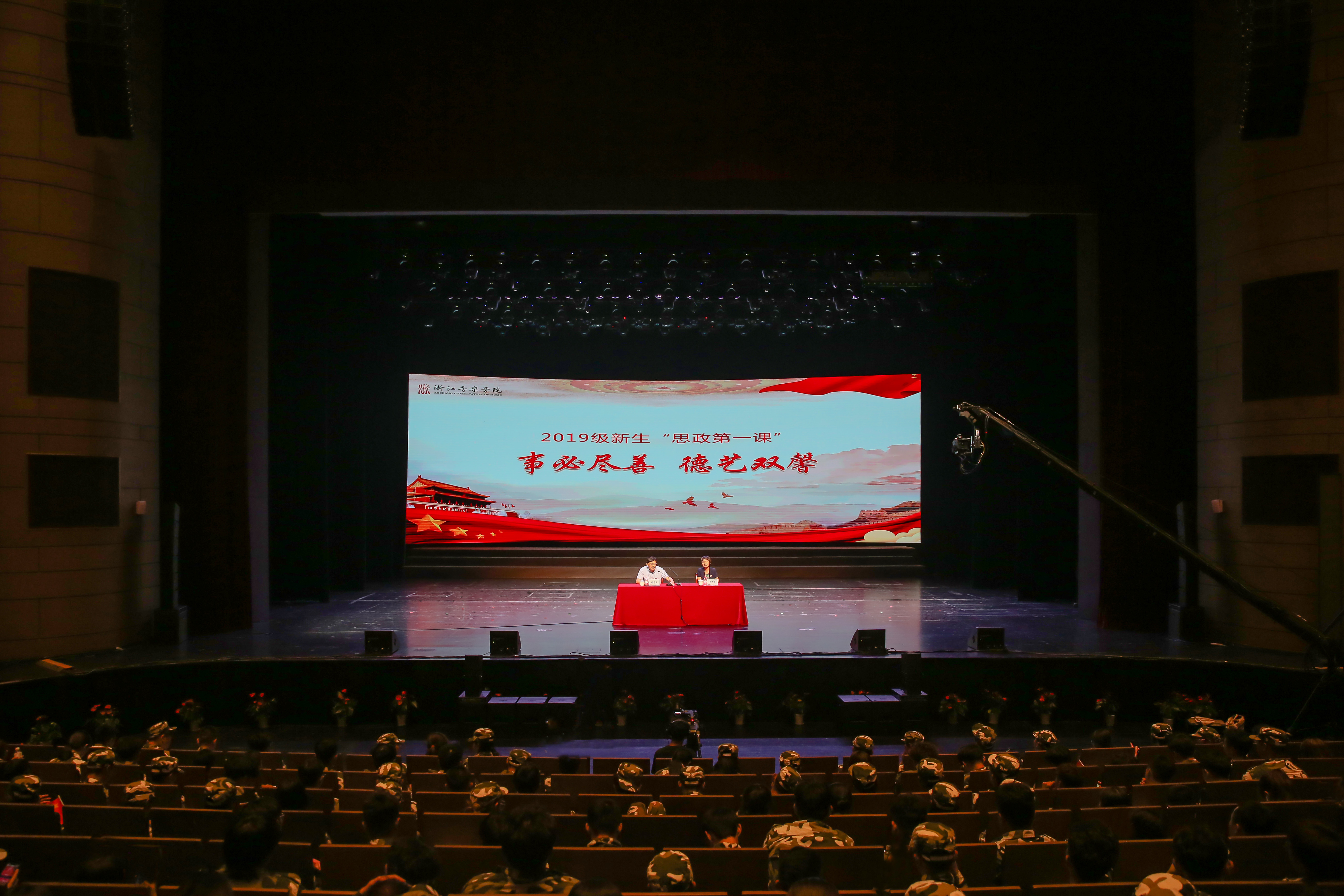 9月20日晚,2019级新生“思政第一课”在学院大剧院隆重举行,学院党委书记胡建新以“事必尽善 德艺双馨”为题,750名新生讲授了一堂内容丰富、生动活泼、思想深刻、意义深远的思政第一课。学院党委副书记贾秀英主持。