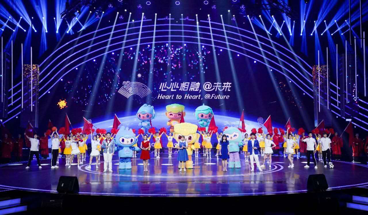 启动仪式上,流行音乐系学生、“好声音”学员邢晗铭、叶炫清、刘珉轩、李凡一、孙振宇和音乐教育系合唱团学生等共同参与了全球直播现场演出。