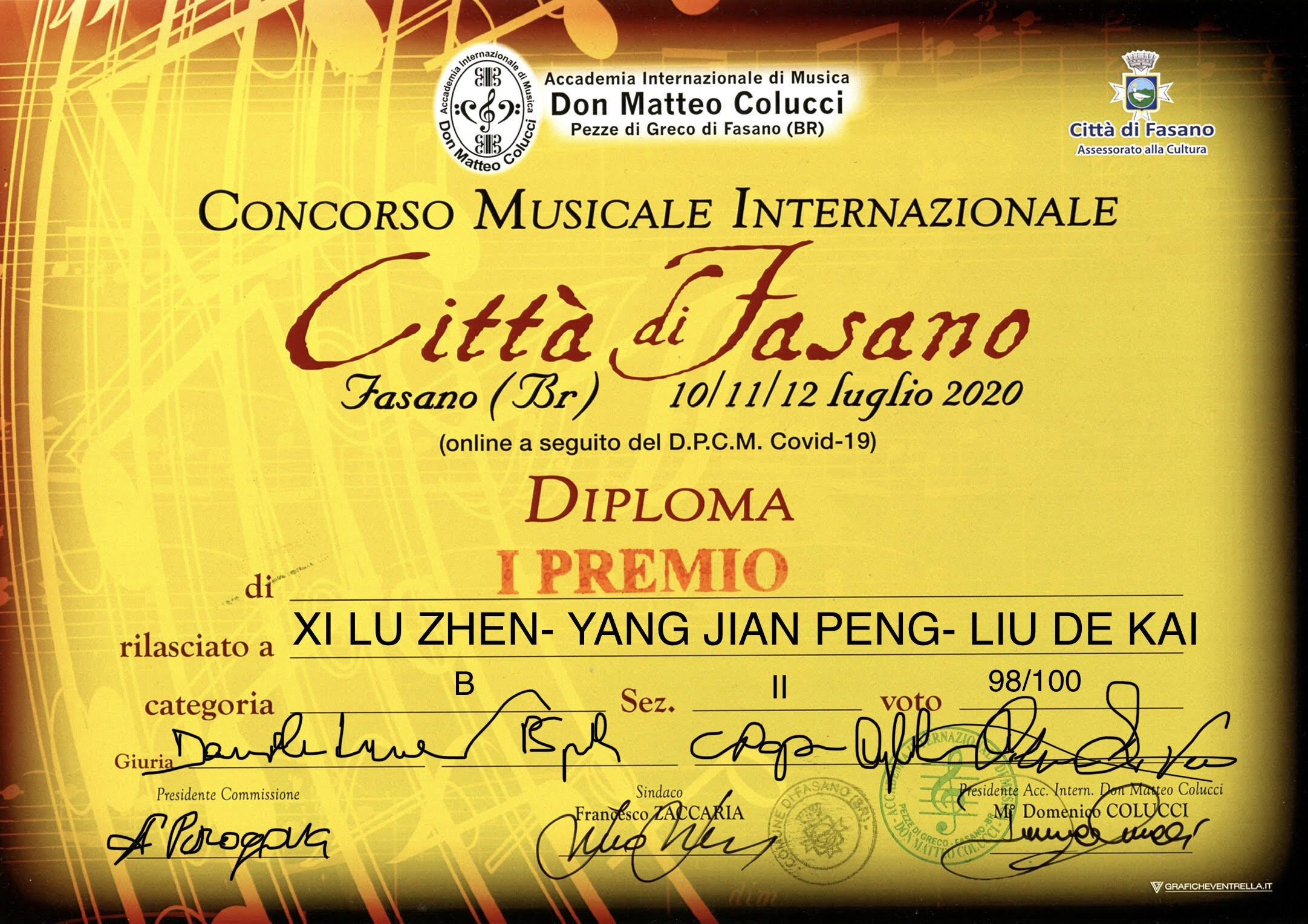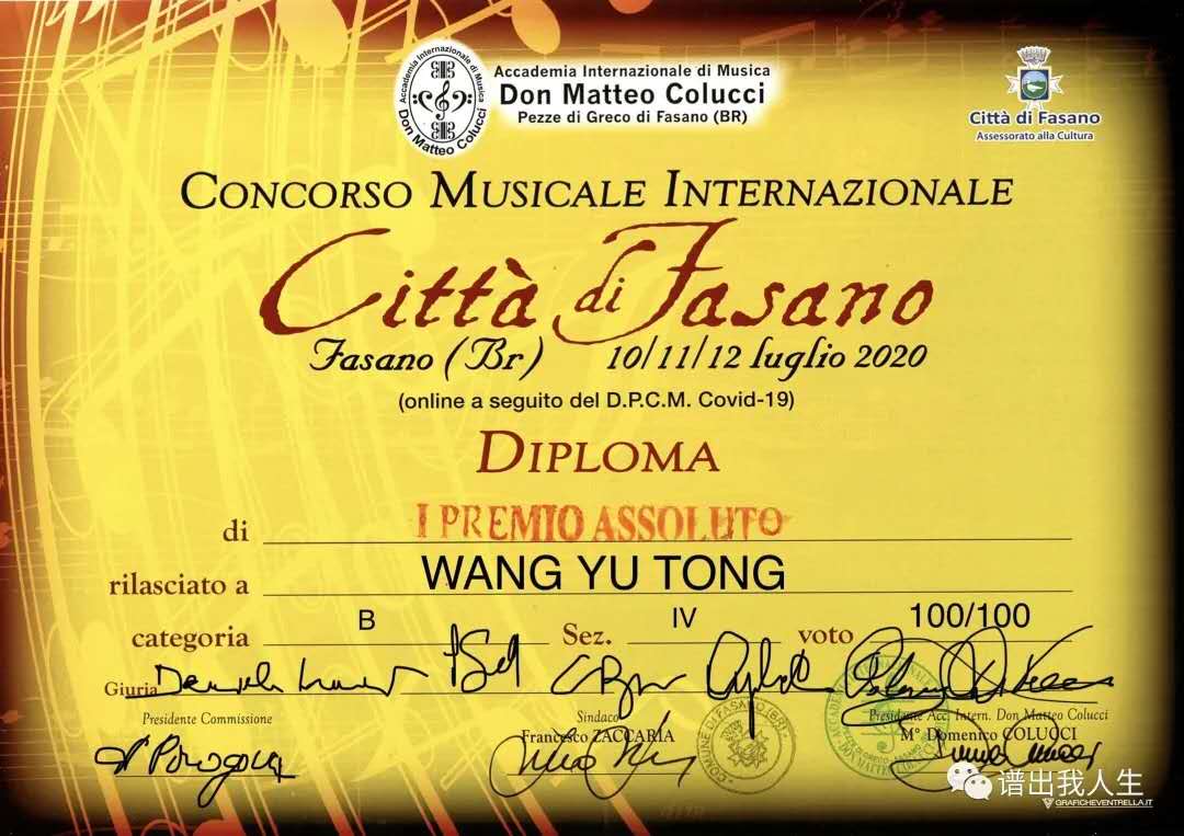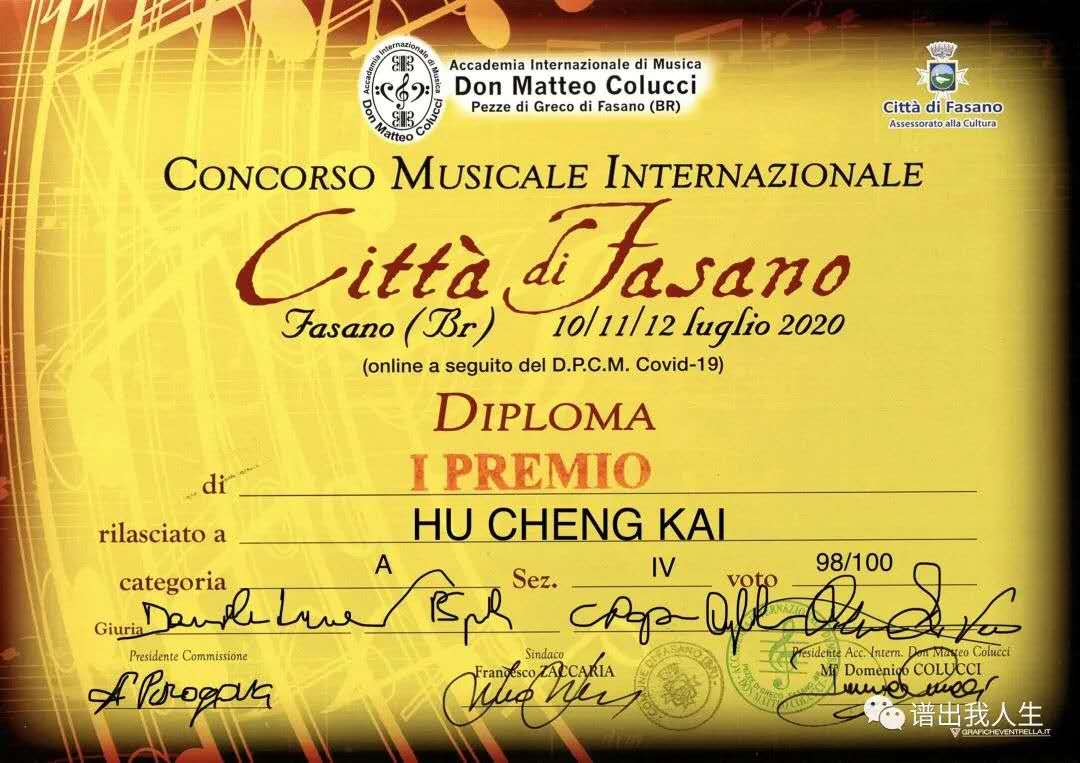 据悉,意大利Fasano国际音乐比赛由Don Mattel Colucci国际音乐学会主办,该赛事原定于3月在意大利法萨诺进行,受新冠疫情影响延迟至710日至12日,并改为线上比赛,评委通过选手上传的比赛视频,集体观看、现场评判。