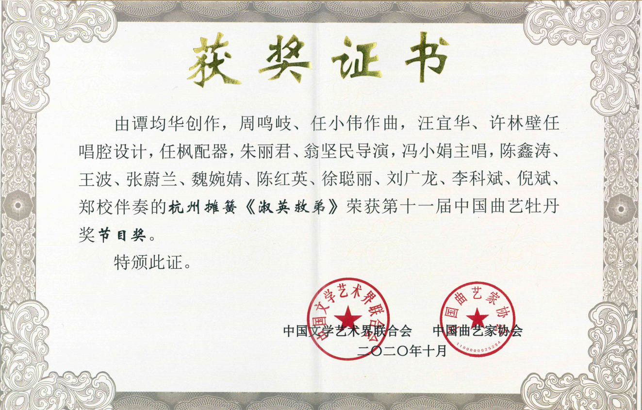10月15日,第十一届中国曲艺牡丹奖颁奖仪式在江苏苏州举行,我校教师蒋巍创作的评书《一次心灵的对话》,荣获第十一届中国曲艺牡丹奖文学奖。冯小娟表演的杭州摊簧《淑英救弟》,荣获第十一届中国曲艺牡丹奖节目奖。“中国曲艺牡丹奖”是由中国文联和中国曲艺家协会共同举办的全国性曲艺艺术专业奖项,是我国曲艺界的最高奖项。本届中国曲艺牡丹奖共评选出节目奖5个、表演奖6个、文学奖4个和新人奖5个。