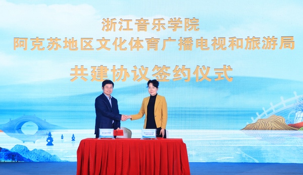10月20日上午,由浙江省文化和旅游厅联合中共阿克苏地委、阿克苏地区行署、浙江省援疆指挥部共同举办的“浙阿文化交流合作”工程启动仪式在新疆阿克苏地区文博院隆重举行。学校党委副书记、副院长张建国带队参加,与阿克苏地区文化体育广播电视和旅游局党组书记王新春共同签署战略合作共建协议,并授牌阿克苏地区塔里木歌舞团 “韵律浙疆工作室”“创作采风基地”。