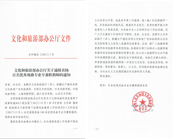 近日,文化和旅游部发布《文化和旅游部办公厅关于通报表扬百名优秀戏曲专业专兼职教师的通知》(办科教发〔2021〕5号),学院戏剧系教师金彩芳、兼职教师胡山岗受到通报表扬。