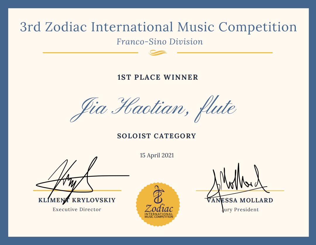 近日,2021法国尼斯Zodiac音乐家和作曲家国际大赛线上比赛落下帷幕。此次比赛旨在发掘世界各地的表演和作曲杰出音乐人,吸引了多个国家不同年龄阶段的选手,通过提交视频、乐谱的形式参与。室内乐学院学员、管弦系18级长笛学生贾淏天,在付珍珍老师的指导下,在大赛中荣获一等奖。