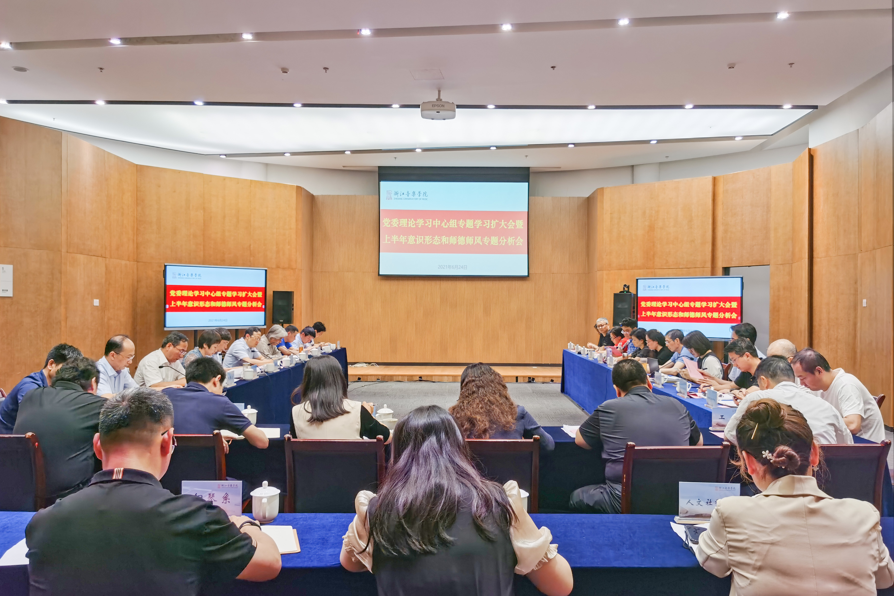 6月24日下午,学院在103会议室召开党委理论学习中心组学习扩大会暨上半年意识形态和师德师风专题分析会。学院党政领导班子成员胡建新、王瑞、贾秀英、杨九华、张伟波、应达伟、李俊,各二级党组织书记、相关职能部门负责人等参加会议。会议由党委书记胡建新主持。