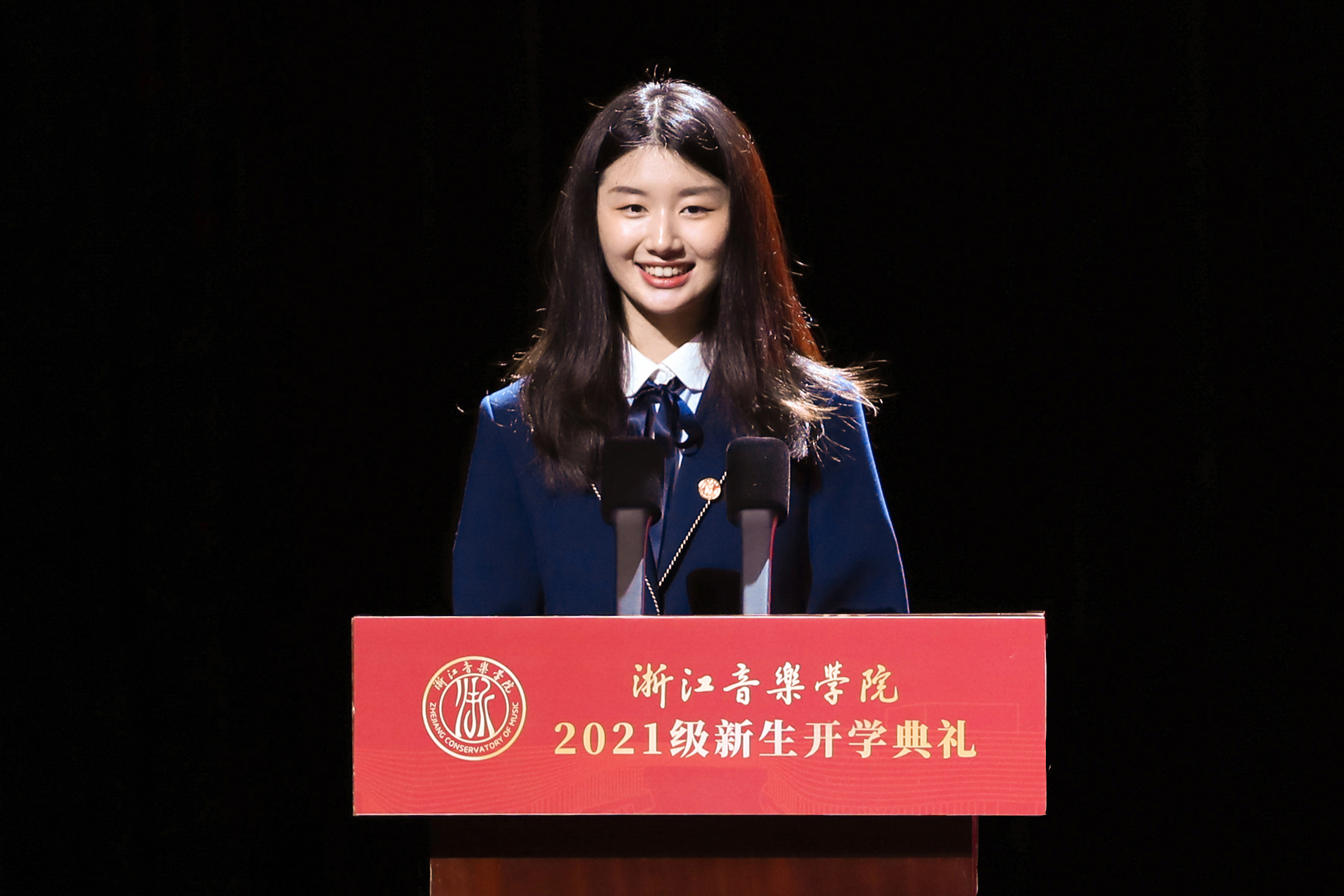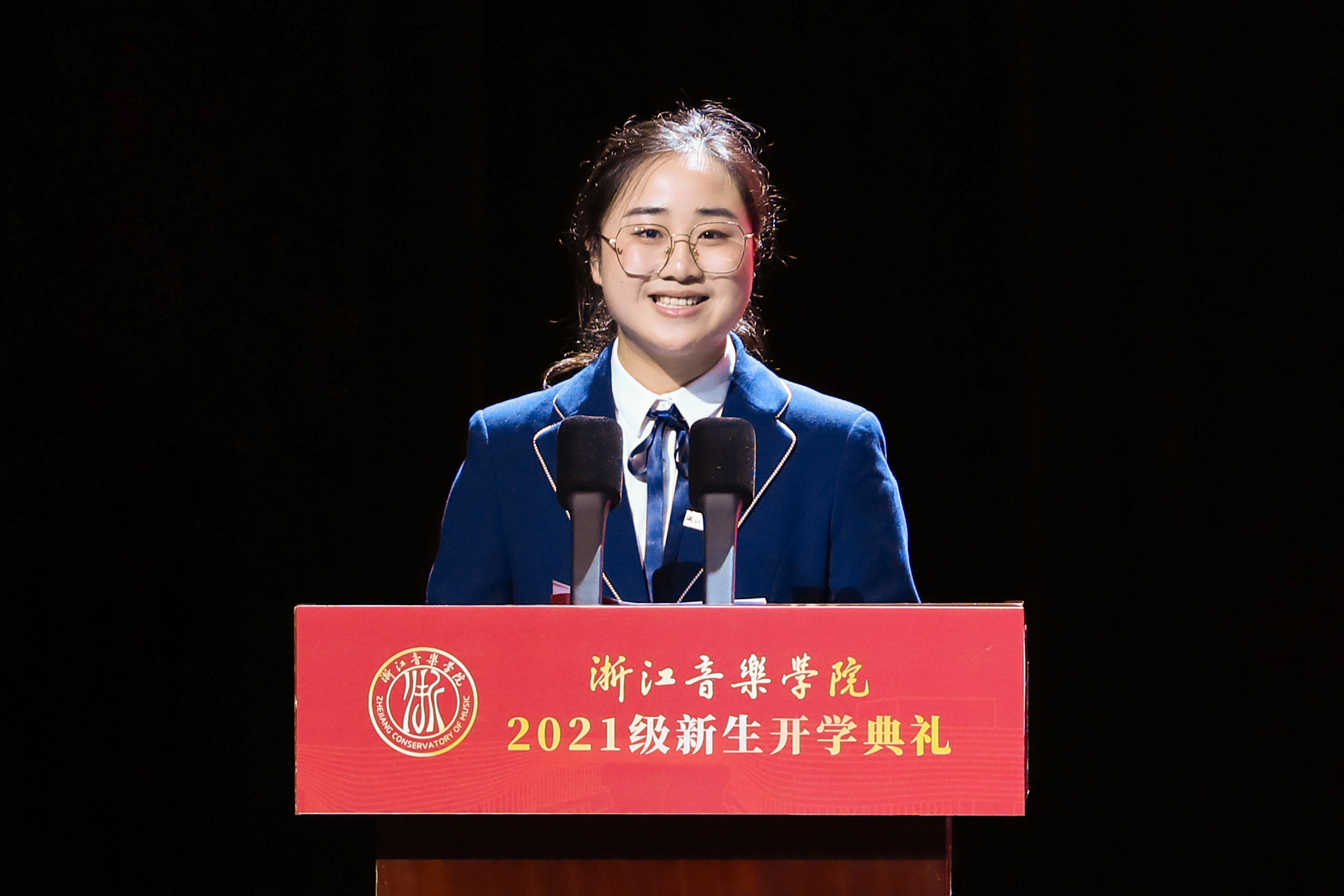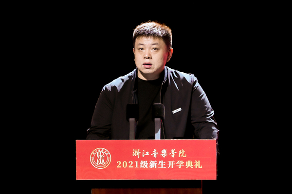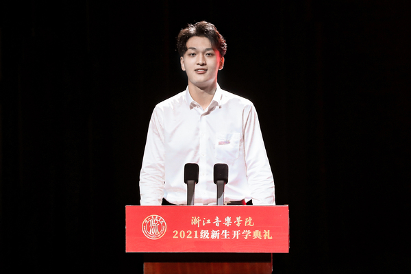 戏剧系戏剧影视表演专业丁小川代表2021级本科生新生发言。他情真意切地回顾了过去的学习经历,表达了对即将开启的大学生活的向往。他说,我们正处在实现“两个一百年”奋斗目标的关键时刻,前无古人的伟大实践必将给文化振兴、文艺繁荣提供强大动力和广阔空间,浙音学子要扛起这个时代所赋予青年学生的担当和使命,为人民创作,为时代讴歌。