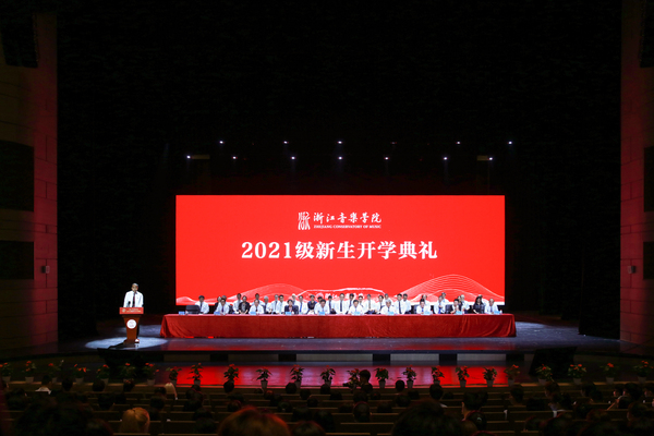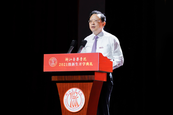 院长王瑞代表学院,向新生表示热烈的欢迎和诚挚的祝贺,并以“事必尽善,知行合一”为题,为新生带来生动的“开学第一课”。他从校园景观艺术家的雕塑讲起,通过李叔同的故事,讲述了学院秉持传承的精神文化,希望同学们传承“学堂乐歌”精神,胸怀国之大者;深入分析了校训“事必尽善”的意义、内涵,讲述了学院在改革创新精神的引领下,取得的跨越式成绩,希望同学们秉持“事必尽善”校训,追寻艺术真谛;传达了中国文联举行“文艺工作者职业道德和行风建设工作座谈会”和《修身守正,立心铸魂——致广大文艺工作者倡议书》精神,深刻剖析了文艺工作者作为美的使者、灵魂工程师的重要意义,希望同学们厚植“人民至上”情怀,践行知行合一。最后,王瑞强调,今年恰逢中国共产党建党100周年,中国已经踏上了实现第二个百年奋斗目标的新征程,有幸身处伟大时代的同学们要秉承浙音“事必尽善”的校训精神,坚守艺术初心,坚定艺术自信,崇德尚艺、知行合一,精益求精、至臻至善,在为祖国为人民立德立言中成就自我、实现价值。