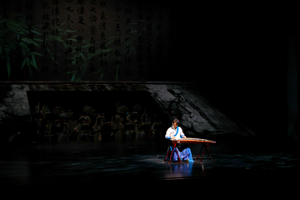 当晚的演出在纯净、幽远、神秘的竹笛声中拉开帷幕。竹笛二重奏《远舟》以浙江地域历史最久远跨湖桥遗址为题材,展现了茫茫洪荒中先民们带着渔猎收获归来的场景,悠悠揭开了浙江文明的曙光。随后的民乐小合奏《良渚》展现古老的良渚人祭祀、劳动、生活场景;古琴与小乐队《凤鸣》传颂了周王朝凤鸣岐山、天下太平、王者政德的古老传说;笙、独舞与小乐队《剑灵》以越王剑历经千年而不减锐气,展现了春秋战国、天下争霸的豪迈气魄;古筝与小乐队《兰亭》以书法与音乐相结合,吟唱着绍兴兰亭、曲水流觞,一缕琴音拨动着心弦的美妙;女高音、昆曲吟诵与小乐队《西子》表达了对“晴方好、雨亦奇”的西湖的深情礼赞;箜篌与小乐队《青瓷》以箜篌类玉似冰的音色,表现了青釉莹莹、千峰翠色的典雅审美;扬琴、畲歌与小乐队《山哈》引领观众走进大山,体验畲族人民每逢佳节以歌对话的特殊民俗和对幸福生活的美好向往;双胡琴、群舞和小乐队《丝绸》则展现出流光溢彩的锦绣在水乡人民手中、在东西文明交融中的迷人魅力。最后,音乐会在民乐小合奏《越地长歌》中落下帷幕,吴侬软语描绘诗画,黄钟大吕奏响华章,通过舞蹈、声乐、器乐及视觉艺术的交汇融合,传颂着浙江地域的历史流转与文化变迁,更是为世代生活在这片土地上勤劳、精进、自强不息、勇于拼搏的人们谱写了一首深情赞歌。