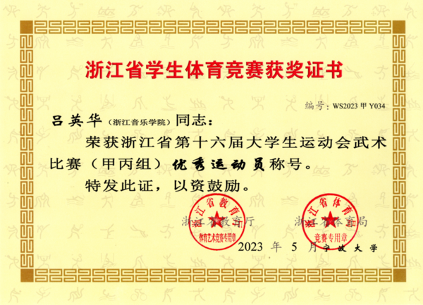 吕英华同学自幼热爱武术、跆拳道等体育运动,进入浙音后,先后获得2022年浙江省空手道联赛冠军、2022杭州市空手道邀请赛冠军、杭州市传统武术比赛冠军、2022年浙江省大学生武术锦标赛亚军等多项荣誉。由于浙音武术队成立时间不长,学校里也没有标准的比赛场地,体育教研室老师们多方联系,多次带领吕英华到外校场地进行场地适应训练,她从不叫苦、从不抱怨。