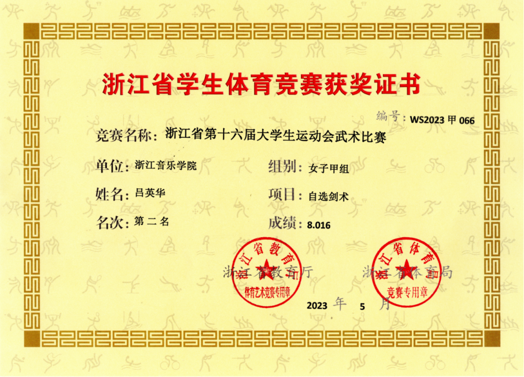 近日,在浙江省第十六届大学生运动会武术比赛中,舞蹈学院舞教201班吕英华同学(指导教师:马俊成)获得女子甲组自选剑术比赛亚军,并荣获优秀运动员称号。这是学院自建校以来,在全省大学生最高级别体育赛事中所取得的最好成绩。