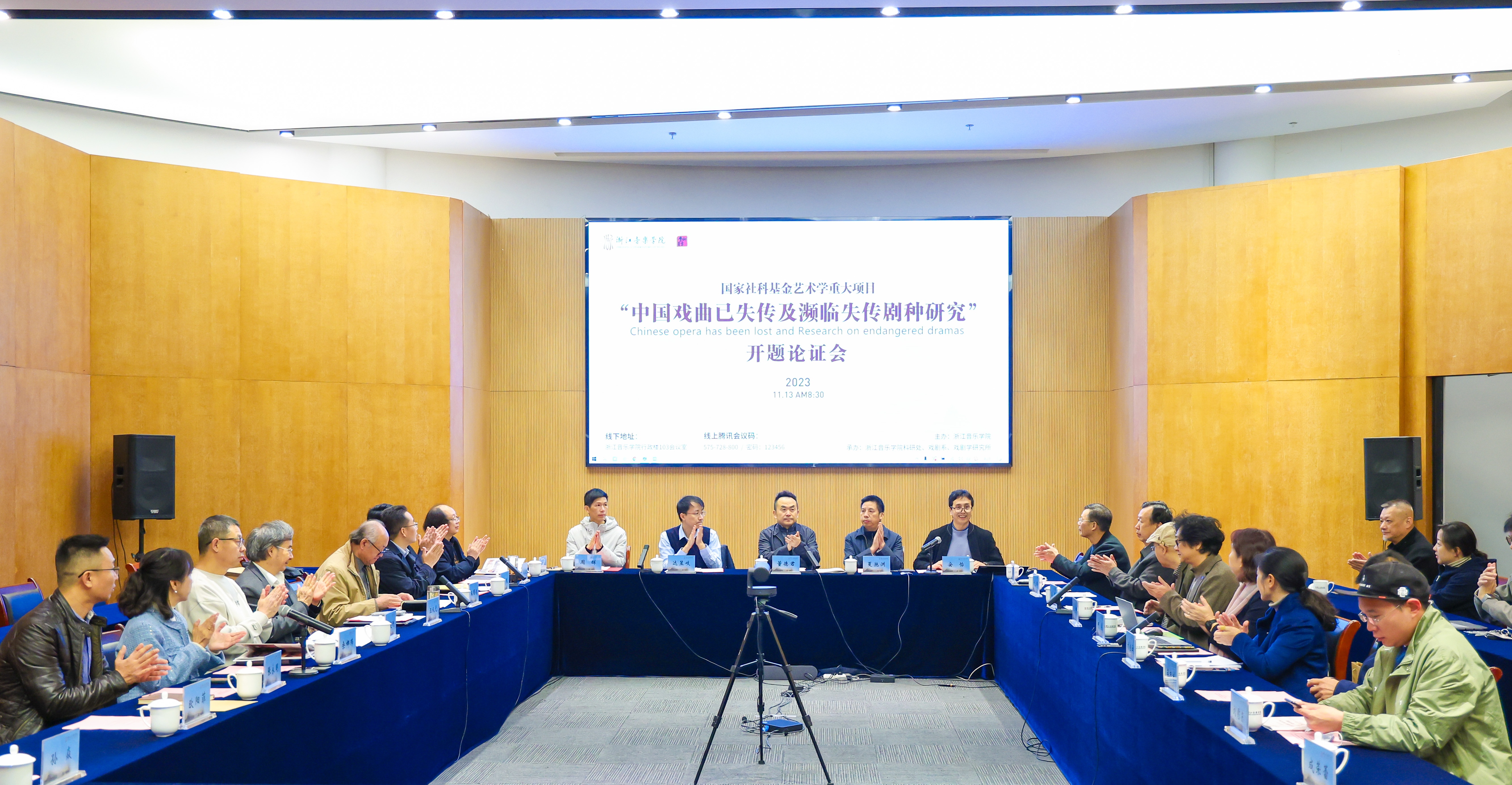 11月13日,由浙音戏剧学研究所申报的2023年度国家社科基金艺术学重大项目《中国戏曲已失传及濒临失传剧种研究》开题论证会在学院成功召开。文化和旅游部科技教育司社科处达昱岐,浙江省文化和旅游厅科教处四级调研员周辉,学院副院长董德君教授,项目首席专家、学院特聘研究员刘文峰教授,项目子课题负责人,以及科研处、戏剧系、戏剧学研究所相关负责人参加开题论证会。