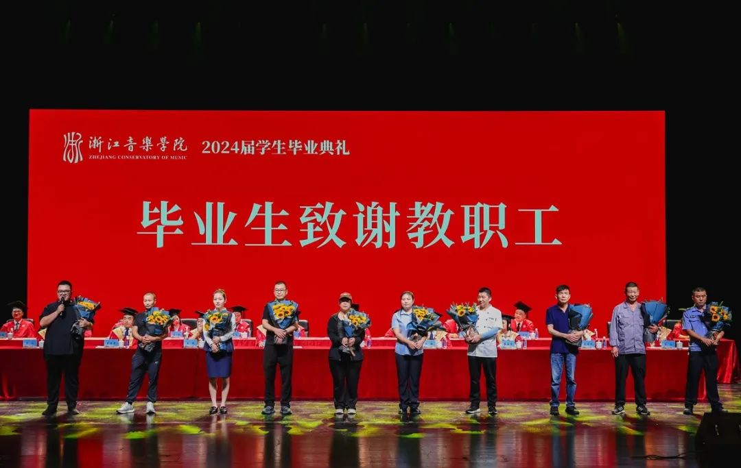 各院系教师代表,以及后勤、乐典等部门职工代表接受毕业生代表献花,并为毕业生送上祝福。